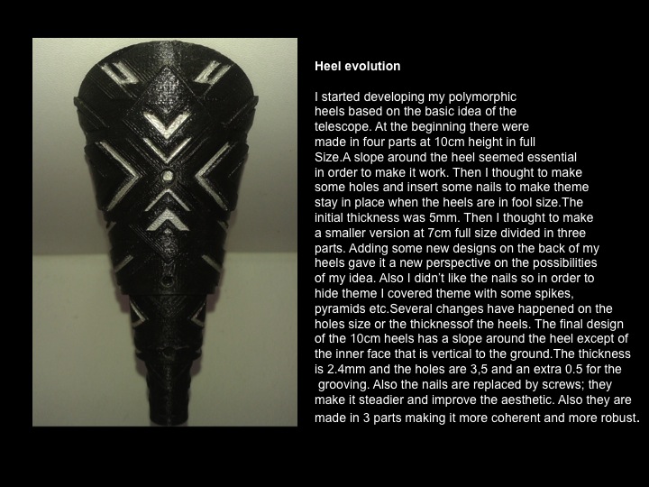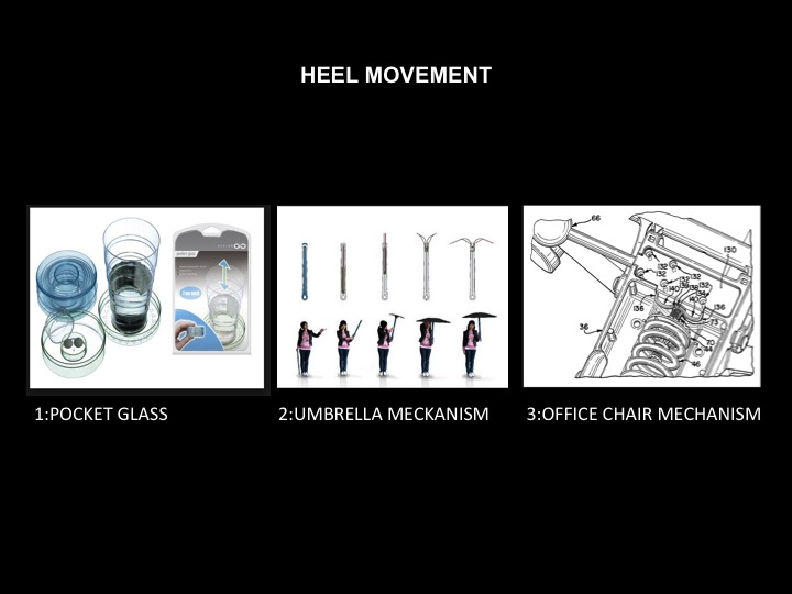 As a fashion designer I decided to challenge myself into creating a new kind of shoes,a combination of high heels and almost flat shoes in one pair.Now I am at the first stage of my research I am trying to find ways to make it possible,some of my first thoughts were inspired of the mechanism of the umbrella,the desk chairs and also of the pocket glass.A normal high heel10mm will be divided in three pieces and the one will be hidden inside the other in order to make it smaller and without external parts .Also with that way it is easier to design on a 3d software.So, this is my idea for my last project ,a pair of shoes that can be modified depending on your needs.