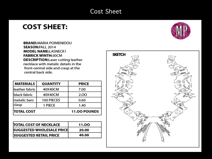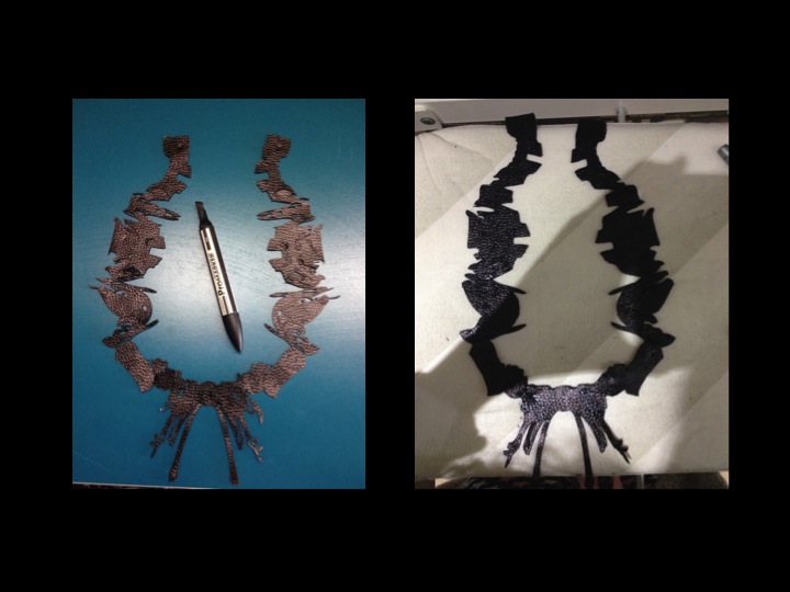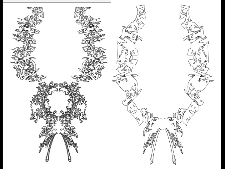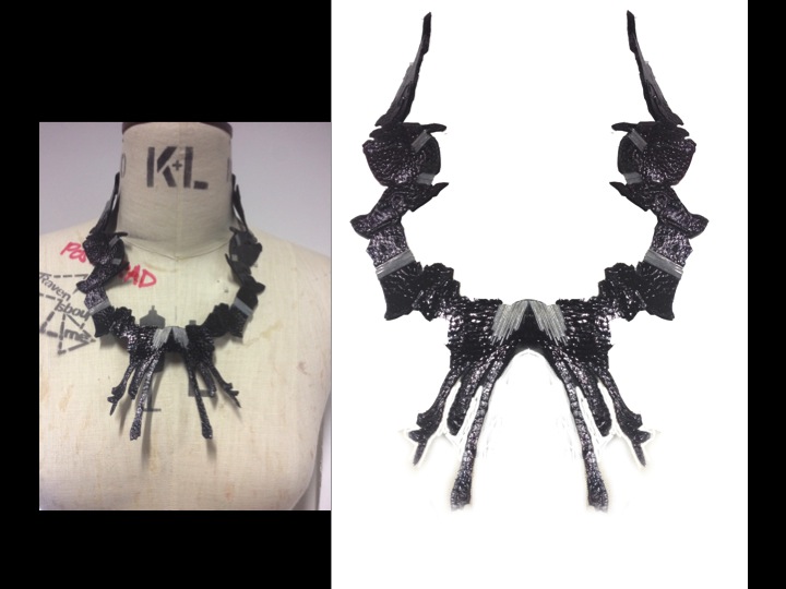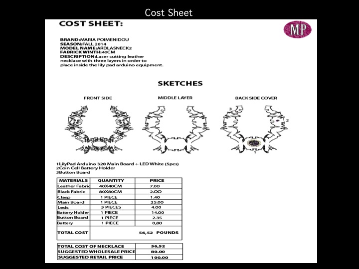From the research, requested from me to produce a product and an in-depth specification sheet where I explain me design and the processes used.The spec sheet also include a clear detailed flat drawing of my product and illustration to show how it is worn. Also I produced a costing sheet of materials used and I calculated the final cost of product. Also i worked with pattern cutting, laser cutting arduino and textile ideas to achieve the best possible interesting design. But in the end I focus on laser cutting technique for the first necklace and also now I want to use the lilypad arduino tablet to create a new necklace for the exhibition at level 39 but at the same time to hold the initially design of the first necklace